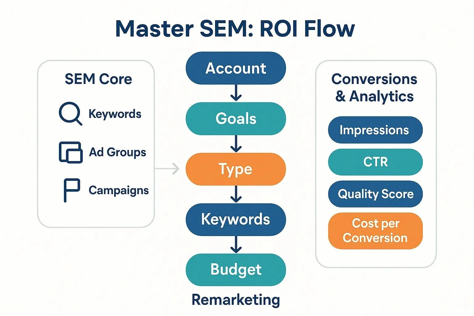 Search Engine Marketing (SEM) is a powerful digital marketing strategy that leverages paid search advertising to enhance online visibility and drive targeted traffic to websites. This comprehensive guide will delve into the intricacies of SEM, focusing on Google Ads campaigns and effective PPC management techniques. Readers will learn how SEM operates, the essential components involved, and the best practices for optimizing campaigns to achieve maximum return on investment (ROI). Many businesses struggle to navigate the complexities of paid search, often leading to wasted budgets and missed opportunities. By understanding the mechanisms of SEM and implementing proven strategies, marketers can significantly improve their campaign performance. This article will cover the fundamentals of SEM, the setup and optimization of Google Ads, key bidding strategies, conversion tracking, remarketing, and the use of analytics for continuous improvement.